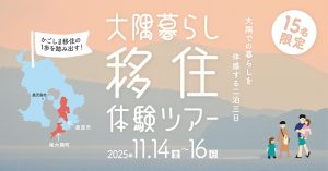 2泊3日で大隅暮らしを体験してみませんか? 鹿児島県内での暮らしを体験できるお試し移住ツアーを開催します!(15名様限定)今回の舞台は「大隅半島」!大隅半島内の「鹿屋市」「南大隅町」で暮らし・交流・住まいを二泊三日で体験いただけます。 このツアーの魅力は、地域での暮らしがイメージ … 続きを読む かごしま移住の1歩を踏み出す!大隅暮らし移住体験ツアー(募集締切9/28)