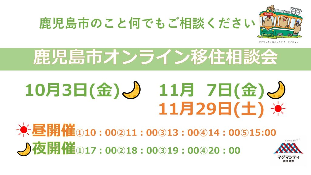 #移住#移住したい#移住地探し#移住支援#移住生活#移住計画#移住検討#地方移住#移住者#移住相談#移住相談会#鹿児島市#鹿児島市役所#鹿児島市移住相談室#かごしま移住ライフ#かごしま市IJU倶楽部#マグマシティ#マグマシティ鹿児島市#鹿児島#鹿児島移住#鹿児島市移住#オンライン相談会