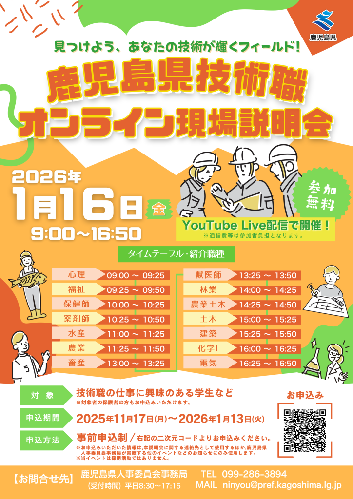 鹿児島県の技術職の仕事に興味がある方を対象に,県内各地で働いている技術系職員が出演し,活躍している現場の様子や,仕事の魅力・やりがいをWEB上で紹介する説明会を開催します!