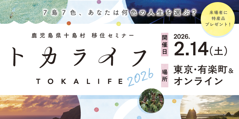 【2/14開催】7島7色、あなたは何色の人生を選ぶ?鹿児島県十島村「トカライフ」移住セミナーが東京・有楽町で開催! #Iターン #Pターン #オンライン開催 #セミナー #マルチワーク #リアル開催 #仕事 #地域づくり #子育て #移住者の声 #離島留学 2025.12.25 NEW
