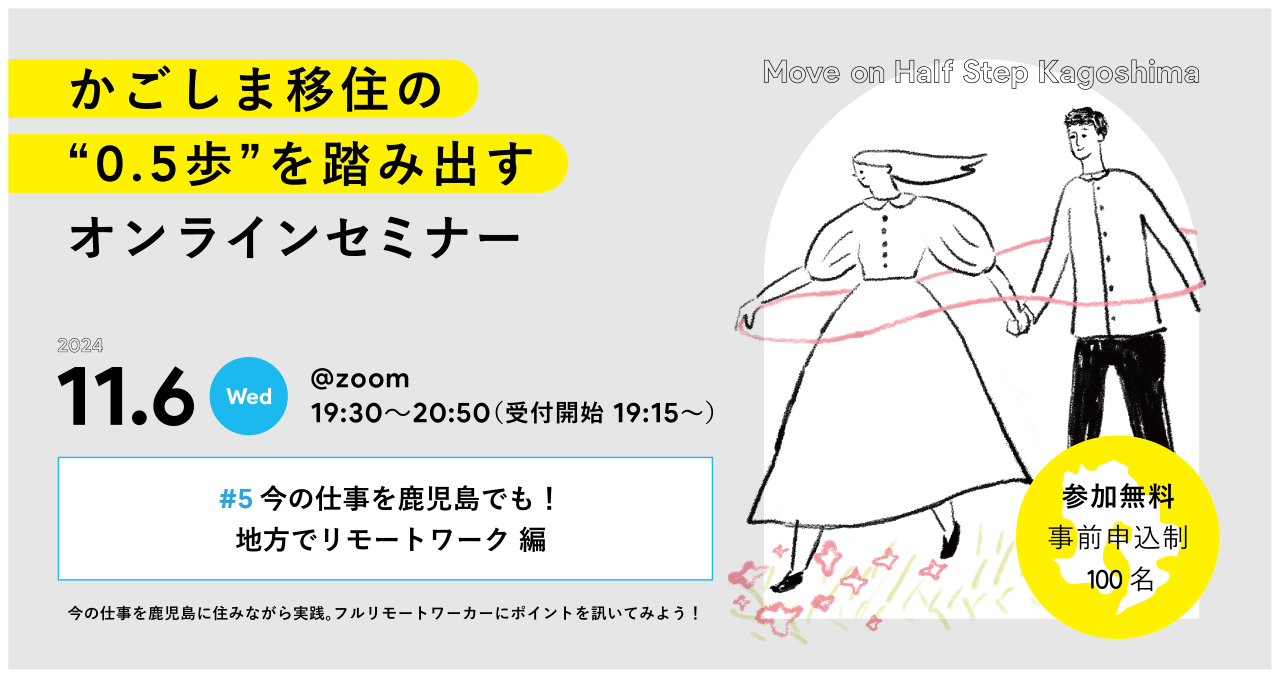 11/6(水)【かごしま移住の0.5歩を踏み出すオンラインセミナー #5】今の仕事を鹿児島でも!地方でリモートワーク 編 #オンライン開催 #セミナー #テレワーク #リモートワーク #在宅勤務 2024.10.11