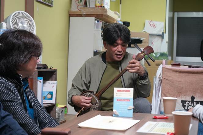 「巡めぐる恵めぐる」代表の新元氏から、島唄のレクチャーを受けました。